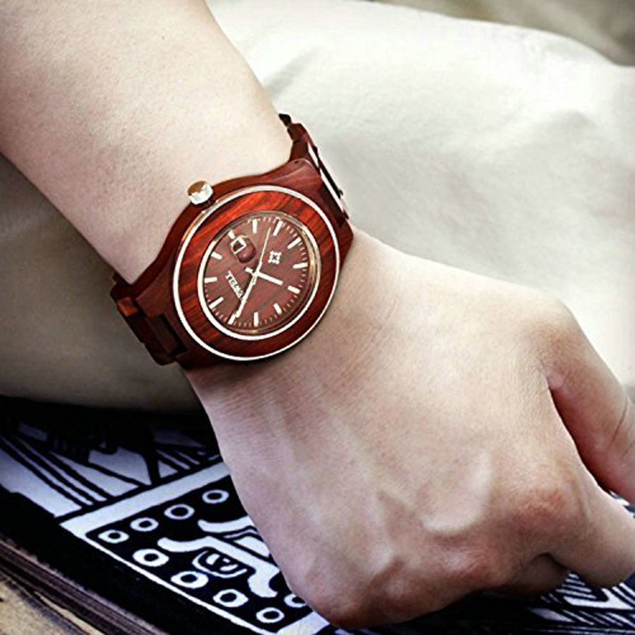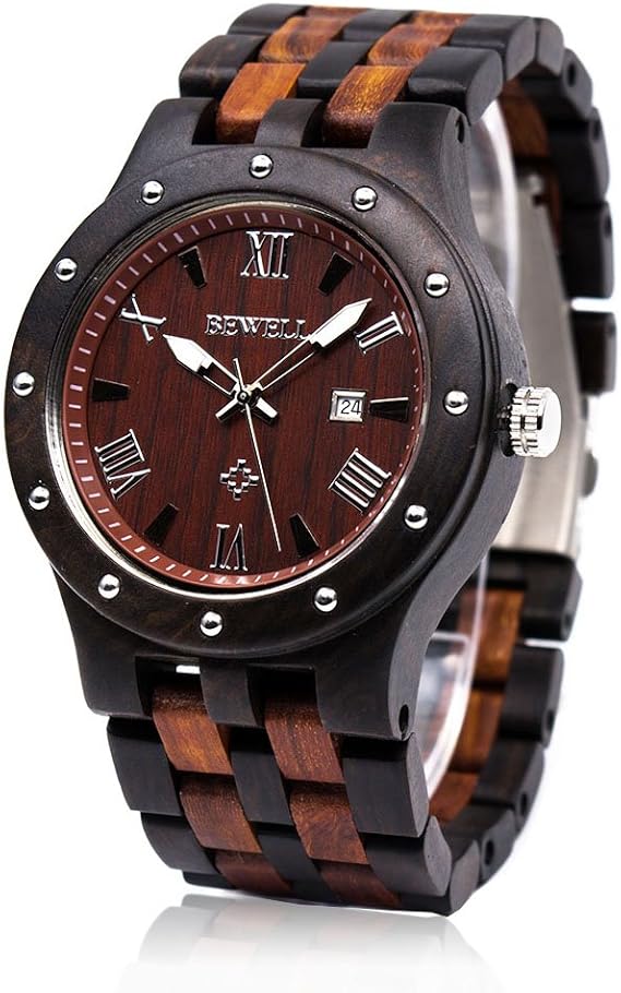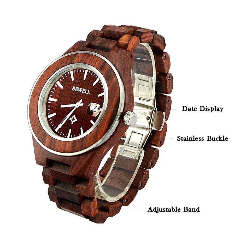 Bewell Herren Naturliche Holz Uhr Retro Quarz Analog Armbanduhr Mit Multi Funktionen Der Kalender Anzeige Und Leuchtenden Zeiger Holzerne Armband Schwarzes Und Rotes Sandelholz Amazon De Uhren